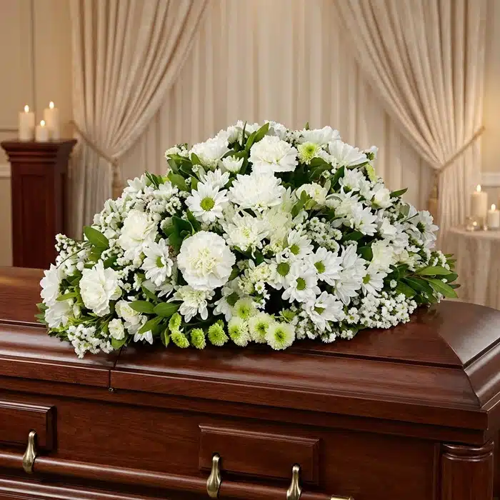 Honra su memoria y acompaña a tus seres queridos con este delicado Cubre Cofre. Un manto de puras rosas blancas, flores primaverales y fresco follaje, diseñado para transmitir paz, luz y un sincero mensaje de respeto en el momento de la despedida. 🕊️