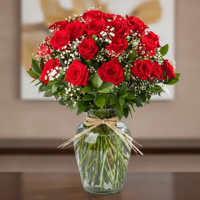 Sugerimos que acompañes este Jarrón con 24 Rosas con chocolates, peluches o vinos para hacer aún más especial tu detalle, en el siguiente paso de la compra puedes agregar a tu orden estos productos si lo deseas.